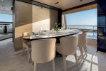 The cockpit with teak flooring is extremely spacious and dedicated to socialising, with a large sofa aft and dining table seating eight. The design of two sky-ground windows (1.6 m by 2 m of glass) located in the dining area is very impressive, as it offers a fantastic natural light and breathtaking view.