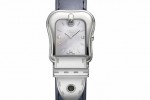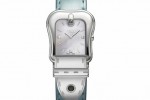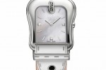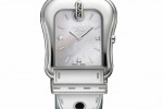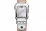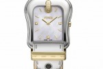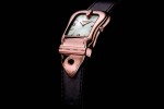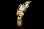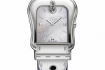 Each is a color-coordinated beauty, with glossying dials and leather straps. The polished stainless steel buckle-shaped case with mother of pearl dial comes with corail, reef and savoia colored straps. The two-tone polished case with mother of pearl dial comes with blonde, nougat, reef and savoia colored straps. In the yellow gold IP polished case with mother of pearl dial or black dial the riccio, blonde and corail colored strap are offered. In the rose gold plated polished case with mother of pear dial comes the riccio colored strap.