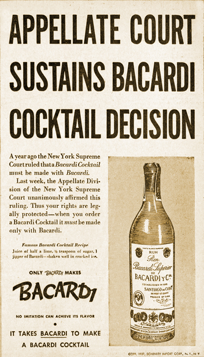 Bacardi toasts 75th Anniversary of NY Supreme Court Ruling. Standing up for the consumer’s right to get what was ordered and to protect the quality of cocktails, Bacardi took legal action against some New York bars and restaurants that replaced lesser quality rums for Bacardi for when they asked for Bacardi cocktails. In 1937 the New York court ruled that a Bacardi Cocktail must be made with Bacardi.