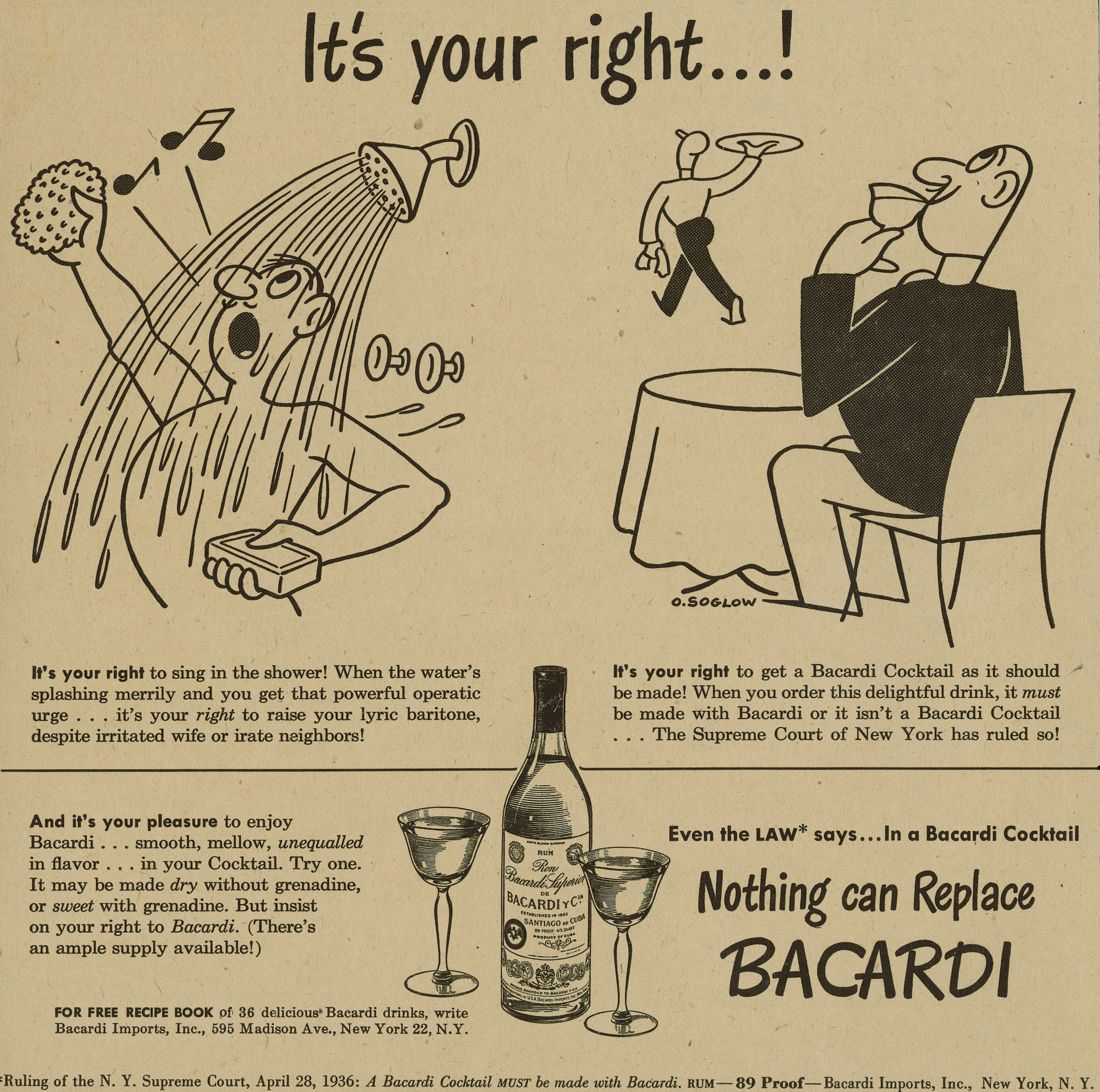 The case created major news and the court milestones were reported by the New York newspapers. The decision was so significant to consumers—to make sure they receive the high quality and great tasting Bacardi cocktail they order—that Bacardi featured the ruling in a popular series of print advertising and marketing campaigns from the late 1930s through the1950s under the theme that “Nothing Takes the Place of Bacardi.”