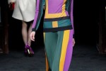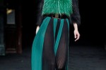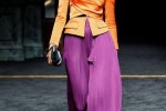 High-waisted flared pleated silk trousers was the key shape, in colours Saint Laurent would have approved, such as like pumpkin orange, sea green and glowing fuchia. These were worn with nipped in jackets in a contrasting shade – orange paired with pink for example – high gold sandals, black sheer tights and earrings made from slices of minerals.