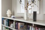 The slim, sculptural structure is the quintessential bookshelf speaker, designed to seamlessly sit anywhere in the home, whether discreetly tucked away or prominently on display. Built to extend sound without taking up space, Beosound Emerge’s resemblance to an interior object allows it to seamlessly integrate alongside books and other domestic objects. The side panels wrap around the speaker like the cover of a book, while the front of the speaker is marked with Bang & Olufsen’s logo in the same way the spine of a book features the author’s name.
