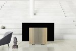 When Beovision Harmony is turned off or just playing music, the thin screen rests close to the floor, partially covered by two meticulously crafted oak and aluminium fronts, which house the powerful sound centre. When Beovision Harmony is turned on, the two fronts fan out and the screen rises to the perfect viewing height. Turn off the TV, and the finely choreographed sequence plays outin reverse.