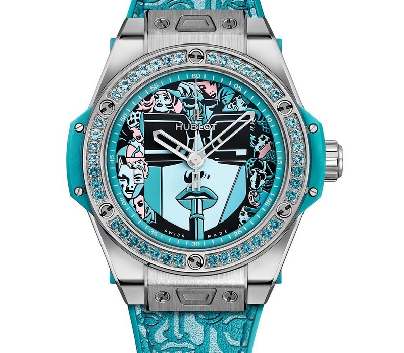 The dial tells the story of this heroine of modern times with ‘Lipstick’, an iconic work by the artist. Spinels in shades of red, topazes for the turquoise version, and forty-two fine stones decorate the bezel of the new 39-mm case. With one touch of its “One Click” patented fastening system, the leather strap makes way for a version in alligator and rubber, a touch of sophistication appropriate for the moment. Available in red and turquoise, the special series will be available in 50 copies of each tone.
