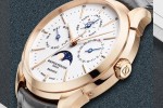 The “warm white” porcelain finish of its dial is enhanced by facetted riveted hour markers and gold-tone hour, minute and seconds hands. Three counters are reserved to the perpetual calendar: the first at 9 o’clock for the day of the week, the second at 12 o’clock for the month and leap year cycle, and the third at 3 o’clock for the perpetual calendar. The blued hands accentuate the calendar functions, and the moon phase indication appears on the dial at 6 o’clock. To ensure better readability, the dial is protected by a domed antiglare sapphire crystal.