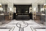 Situated on the lower floor and separated completely from the rest of the property, the master bedroom functions as a sanctuary designed with relaxation in mind. The lacquered finish wardrobes and Alcantara upholstered headboard hint, once again, at the properties art-deco origins; decadent and striking yet unmistakably contemporary. The master en-suite is the embodiment of luxury and sophistication, its white marble floor is enhanced by black and gold geometric shapes, which complements the focal point of the room, a black marble soaker bath. The walls are mirrored, which not only enhances the luxurious feel of the space but also makes it appear both bigger and lighter.