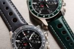 feature a black dial inspired by the E-type’s instrument gauges. The chamfered hour and minute hands replicate the car’s tachometer needle. The bezel and strap colours match the E-type 60 Edition pantones of ‘Flat Out Grey’ and ‘Drop Everything Green’.