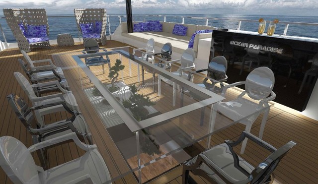 Ocean Paradise is one of the latest creation of the Tuscan shipyard and has been one of the queens of the Monaco Yacht Show 2013. Green technologies aboard the Ocean Paradise include a system that reabsorbs greenhouse gas emissions, next-generation LED lights, enhanced fuel efficiency and a new coating on the hull of the yacht reducing resistance.