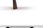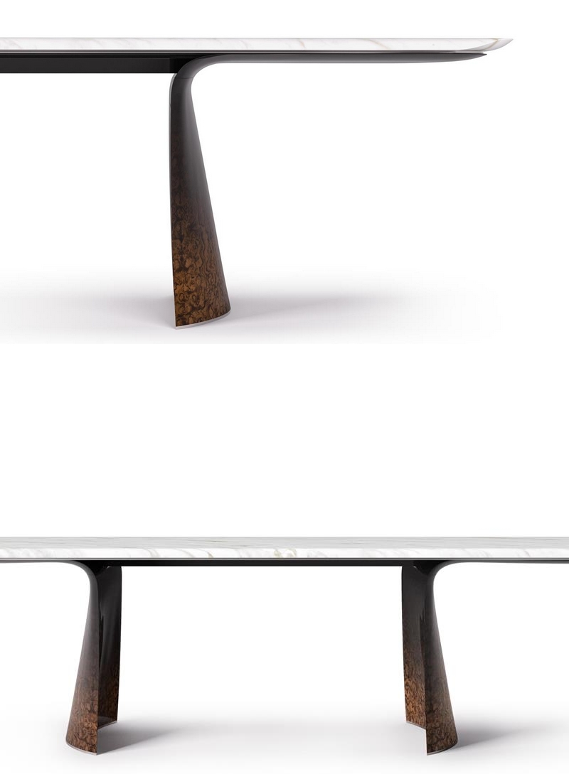versions available to choose from. Legs taper up from the floor and meet under the top in a single form, accentuating the sense of lightness and suspension. The design is enhanced by the three layers that make up the tabletop: the underside is lacquered in glossy black, and a metal profile runs around the perimeter.
