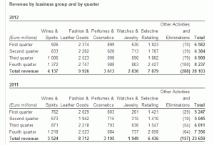 LVMH – revenue by business group and by quarter 2011 vs 2012