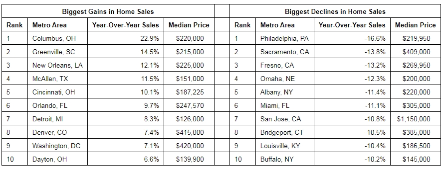 Columbus, OH, Greenville, SC, New Orleans, LA, McAllen, TX, and Cincinnati, OH recorded the biggest gains in home sales.