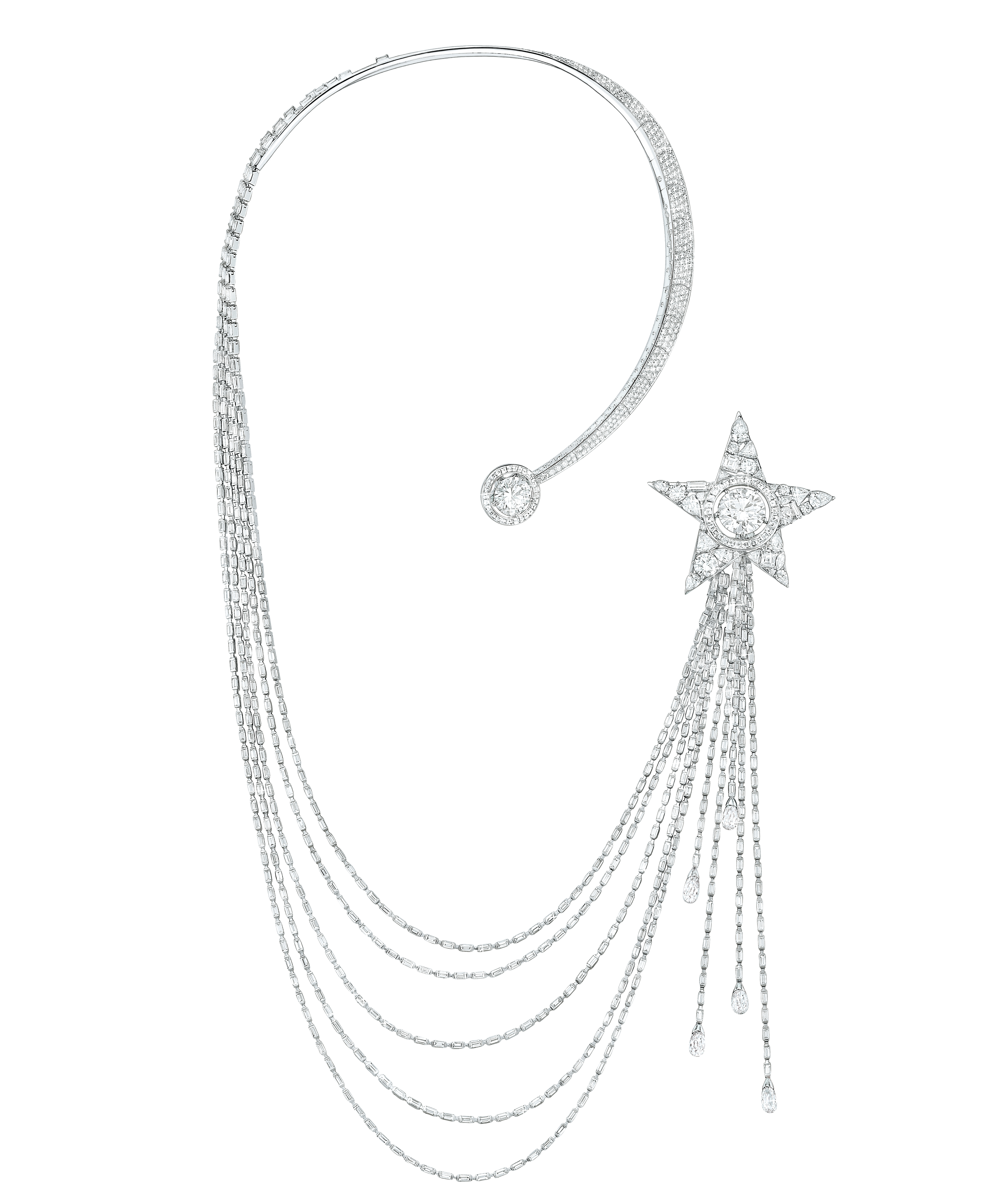 Looking at the original designs – the “Comète” necklace, star or node, or the fringes bracelet, the jewelry never lost the sparkling charisma. The “Comet” became “Shooting Star“, and is redrawn on a necklace that can be worn as a brooch.