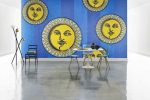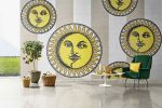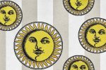 The sun is another star in this collection. In Soli a Capri, a compilation of brilliant suns whimsically portrays the face of Piero Fornasetti, lighting up a background in shades of blue or grey.
