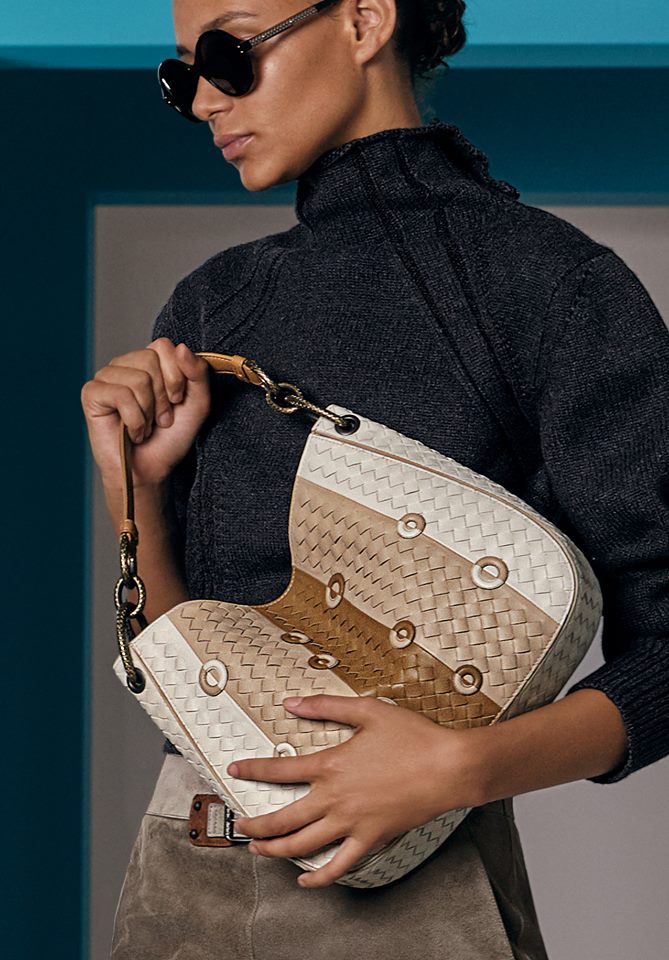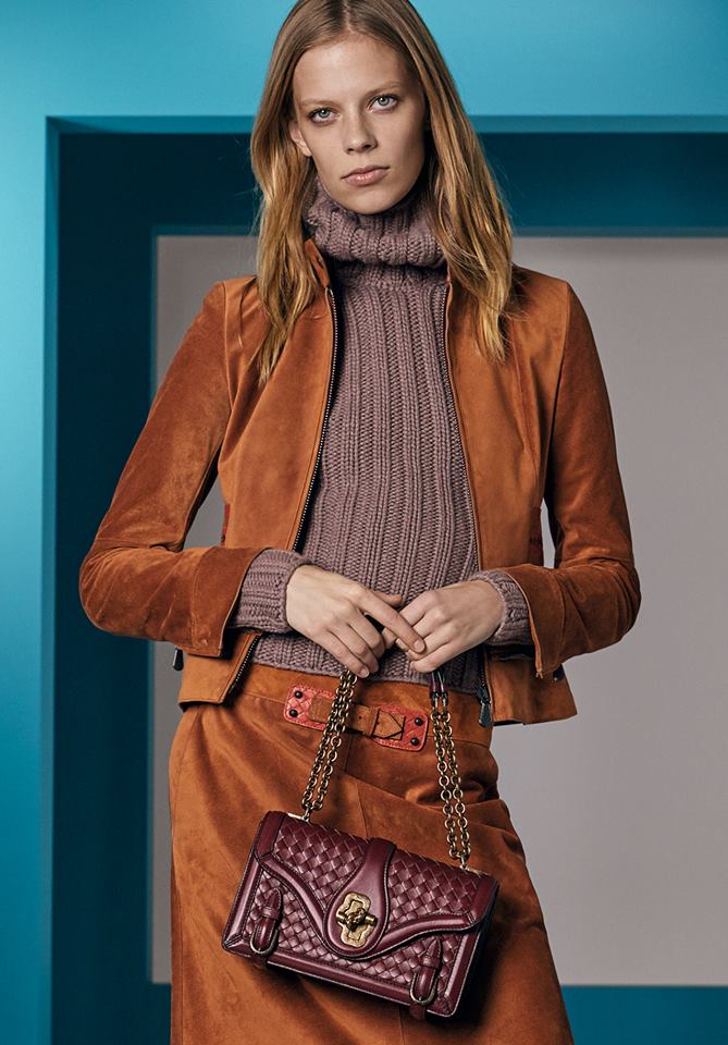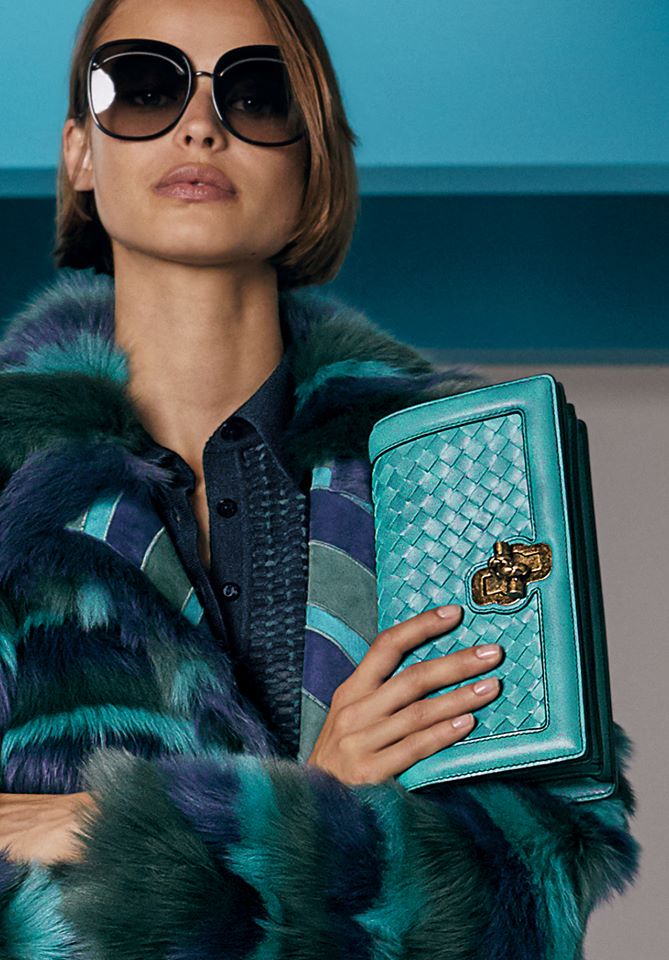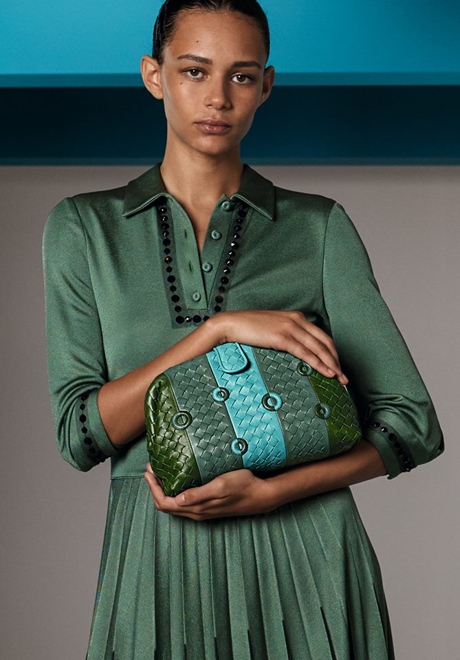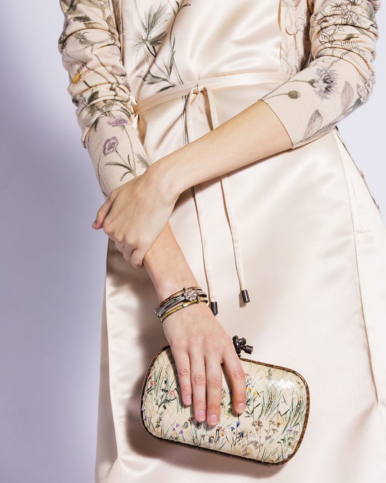Bottega Veneta‘s classic bags get luxurious updates in the Cruise 2018 collection. The Lauren 1980 bag is new in striped intrecciato with Oculus embroidery. The City Knot now comes in decadent Barolo, while the Knot Clutch is fresh in Aqua as well as hand-painted elaphe, karung and ayers. A heritage in craft is realized in the contrast intrecciato of the Mini Montebello, while the Meadow Flower motif embodies the season’s sprightly mood with its linear floral embroidery and pastel palette.