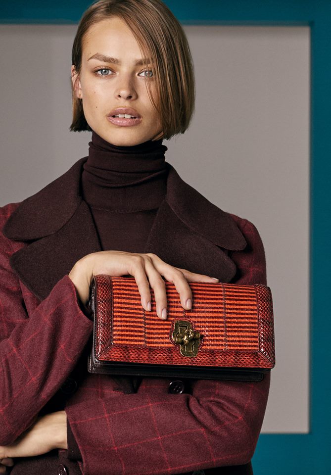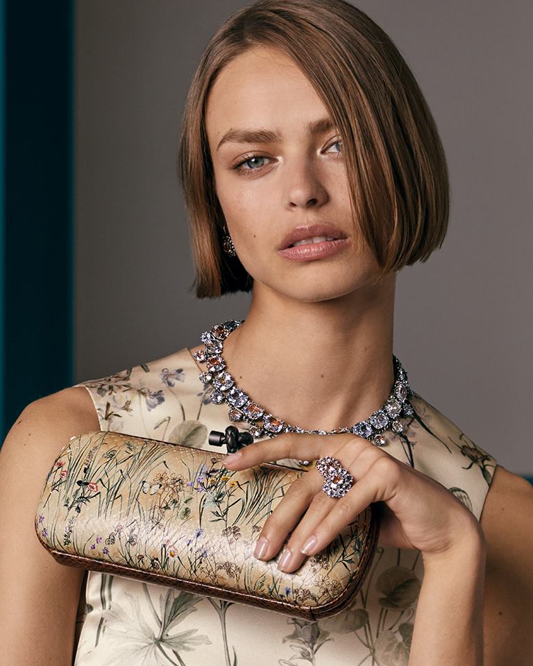 Discover the world’s most prestigious gatherings & exhibitions“It’s a very tricky process since there are so many colors of shading within each flower,” says creative director Tomas Maier. “Normally, you have two to eight, but these prints often contain over 30.” The print was used in a number of luxuriously textured pieces—from a slim cashmere cardigan to tech duchesse dresses, and even a snakeskin Knot minaudière and elegantly retro snakeskin Mary Janes.