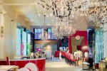 The details include a curved lacquer-lipstick-red bar and checkout desk, Gi-normous crystal chandeliers, several encased in openwork iron gyres, and matching standing lamps, plus a mirrored library. The highlights include the table with Swarovski crystal-studded bottles and a candle table.