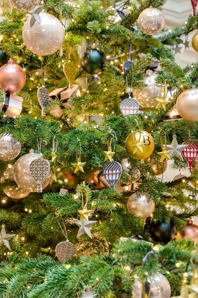 On entering the hotel, guests are welcomed by a snow-laden forest scene crafted by the hotel’s resident florist, Ellie Hartley, and pass beneath a series of suspended, bespoke Boodles hot air balloons guiding them through to the main Christmas tree adorned with further hand-crafted miniature hot air balloons, carrying pale pink Boodles gift boxes, and festive stars, reminiscent of a winter’s night brought to life with twinkling lights.