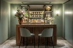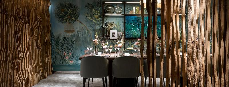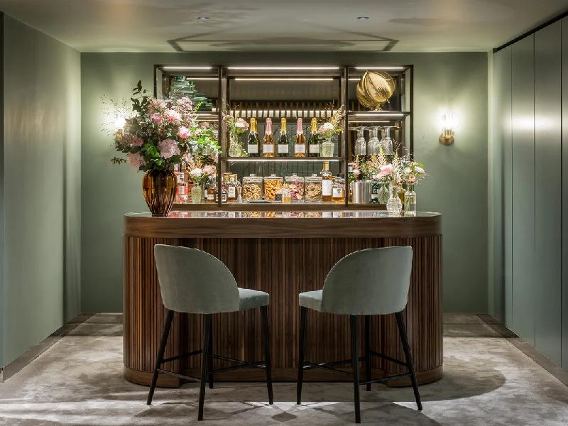 The rawness and beauty of the natural oak is juxtaposed with bespoke hand-painted floral wallpaper and sourced furniture supporting UK artisan craft workshops. The designed bar includes a glass-topped jewellery showcase, to tempt guests to adorn themselves with pieces from the Boodles jewellery collection.