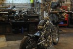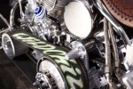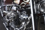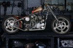 Handbuilt in Brooklyn, New York, for the Discovery Channel “Biker Build-Off” series, “Wild Child” is considered by many to be the pinnacle of Indian Larry’s artistic achievements. It features his signature dished tank, root beer metal flake paint, twisted down tube frame, and a truly unique engine with a shovelhead front cylinder, panhead rear, and jockey shift. An open belt drive is emblazoned with the “Wild Child” name.