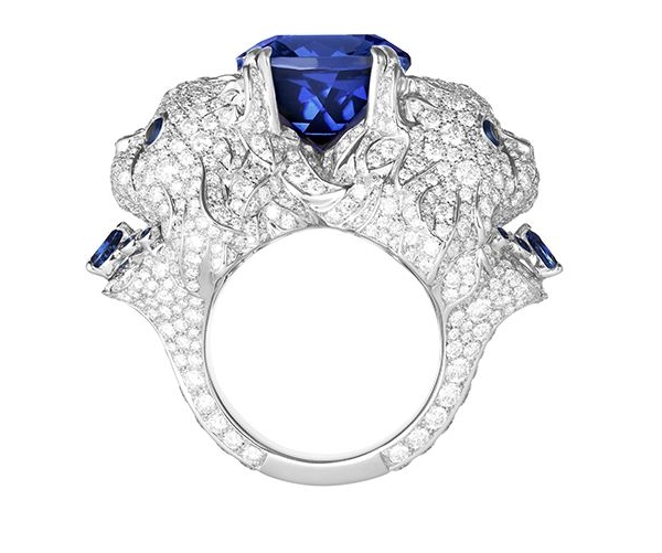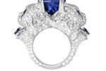A double row of cultured pearls joined by a clasp-jewel paved with diamonds makes for a spectacular choker, and, as an offering to Wladimir, a detachable feline pendant brooch. In white gold entirely paved with diamonds, with sapphire eyes, quivering whiskers, fur sculpted with extraordinary naturalness, and wearing a necklace sparkling with blue tanzanites, he is a testimony to the Boucheron High Jewelry workshops‘ mastery of volumes.