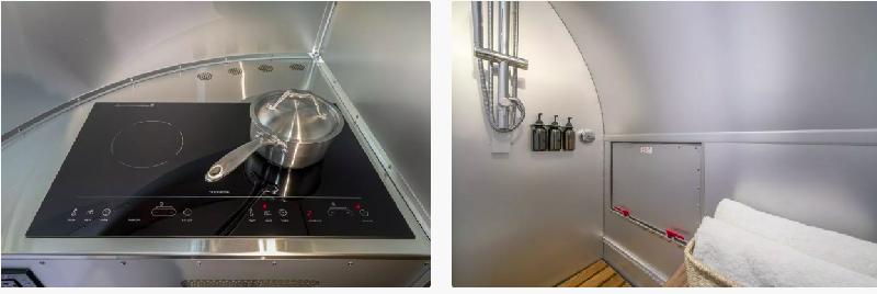 The 2023 Bowlus Volterra is the first travel trailer to feature an induction cooktop. This provides faster and more energy-efficient heating than gas counterparts and better cooking, with precise temperature control and less ambient heat than gas. It is a safer way to cook without emitting gas into the air, and it keeps the Volterra 100-percent electric.