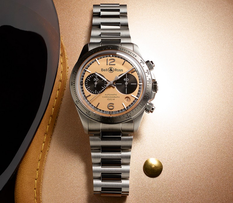 The sportier BR V2-94 with 41mm polished steel case is equipped with BR-CAL.301 calibre with two symmetrical chronograph counters: a 30-minute counter at 9 o’clock and a central 60-second counter. We also have the date sitting between 4 and 5 o’clock.The dial features the contrasting black counters against a gold dial.