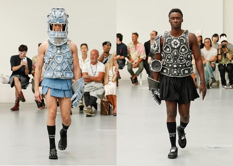 Charles Jeffrey LOVERBOY showcased a collection of decorative suits of armour at Milan Fashion Week 2023 that were intricately constructed from pre-loved Jasperware. These showpieces tapped into Josiah Wedgwood’s legacy as a politically active patron of the arts, a prelude to future LOVERBOY x Wedgwood capsule collections.