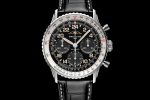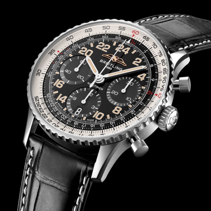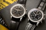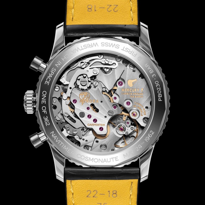 This watch faithfully honors the aesthetics of the original, with subtle updates that work almost imperceptibly to provide its modern-retro appeal. What you can’t overlook, however, are its luxe upgrades like the platinum bezel and open sapphire crystal caseback that gives a window on the Breitling manufacture B02 movement. Special engravings on the caliber bridges, such as Carpenter, Mercury 7, Three orbits around earth and a replica uniform badge from the rocket’s space capsule, mark the occasion. As a final tribute, the caseback is engraved with the mission date, the limitation to 362 pieces and the phrase First Swiss wristwatch in space.