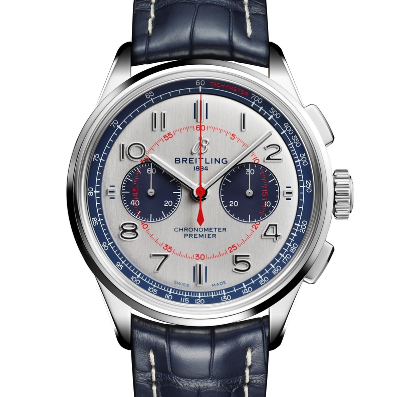 Premier B01 Chronograph 42 Bentley Mulliner Limited Edition (1,000 pcs) with Silver dial, blue subdials, blue alligator strap with folding clasp is priced at EUR: 8,100 / USD: 8,650. The Premier B01 Chronograph 42 Bentley Mulliner Limited Edition (1,000 pcs) Silver dial, blue subdials, blue alligator strap with tang-type buckle costs EUR: 7,900/ USD: 8,350.