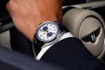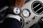 The watch dial features a white tachymeter scale on a blue inner bezel around the dial, with a red tachymeter inscription. The red second hand and centered 60-minute scale mirror the red stitching found throughout the interior cabin of the Bentley Continental GT Mulliner Convertible. The links between the watch and the Continental GT Mulliner Convertible clock are further strengthened by their complementary sets of Arabic numerals: the dashboard clock features the numerals at 12, 3, 6 and 9, while the watch has them at 1, 2, 4, 5, 7, 8, 10 and 11. Sharing these numerals across these two pieces is a nod to