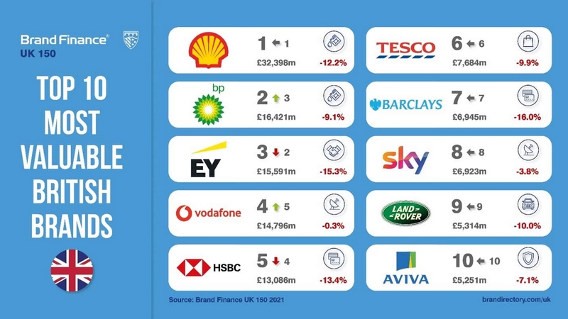 £32.4 billion. Despite a 12% brand value decline, Shell continues to lead the list comfortably, with a brand value nearly double that of second-placed BP (down 9% to £16.4 billion).