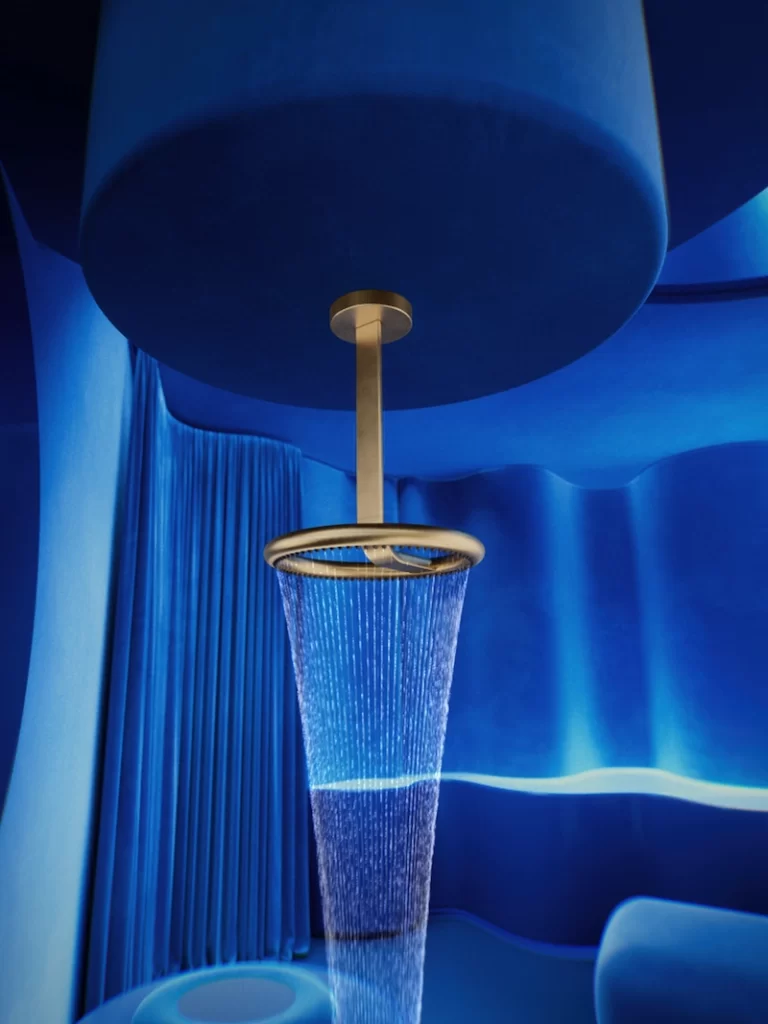 The outdoor shower proposition is, if anything, even more aspirational. Picture either the celestial Litze or the streamlined Odin Pressure Balance Valve Trim feeding a 12-inch single-function raincan shower head, mounted on a 10-inch arm and flange — all of it built for open air, all of it beautiful enough to be the visual anchor of a garden or pool surround. It won’t be available until late 2026, but it’s worth marking the calendar now. The concept of a shower you actually look forward to being seen using — outdoors, in full view of your guests — is a genuinely new kind of luxury.