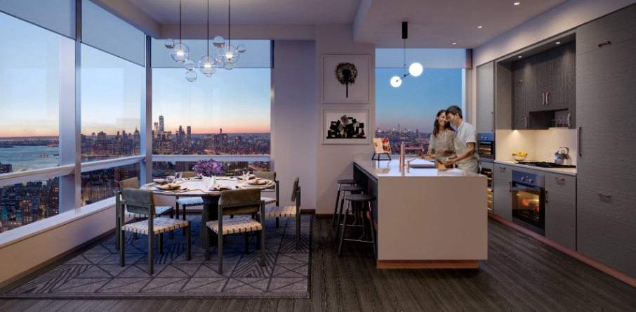Designed by Kohn Pedersen Fox with interiors by AD100 designer Katherine Newman, the skyscraper is offering a mix of studio to three-bedroom residences. Pricing for the studio to three-bedroom residences start at $850,000. Brooklyn Point benefits from a 25-year tax abatement.