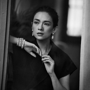 Carolyn Murphy in Opera jewels elegantly walking across Piazza della Signoria in Florence-