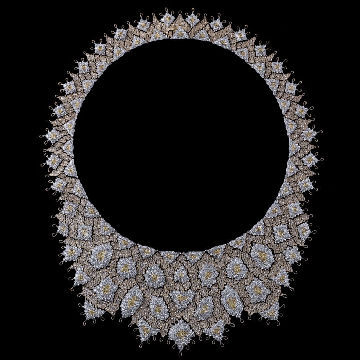 Just as in a brocade fabric, white and yellow gold alternate to create elements which show up according to the view angle, the light and the observer’s emotiveness.