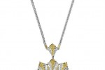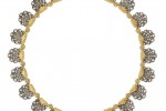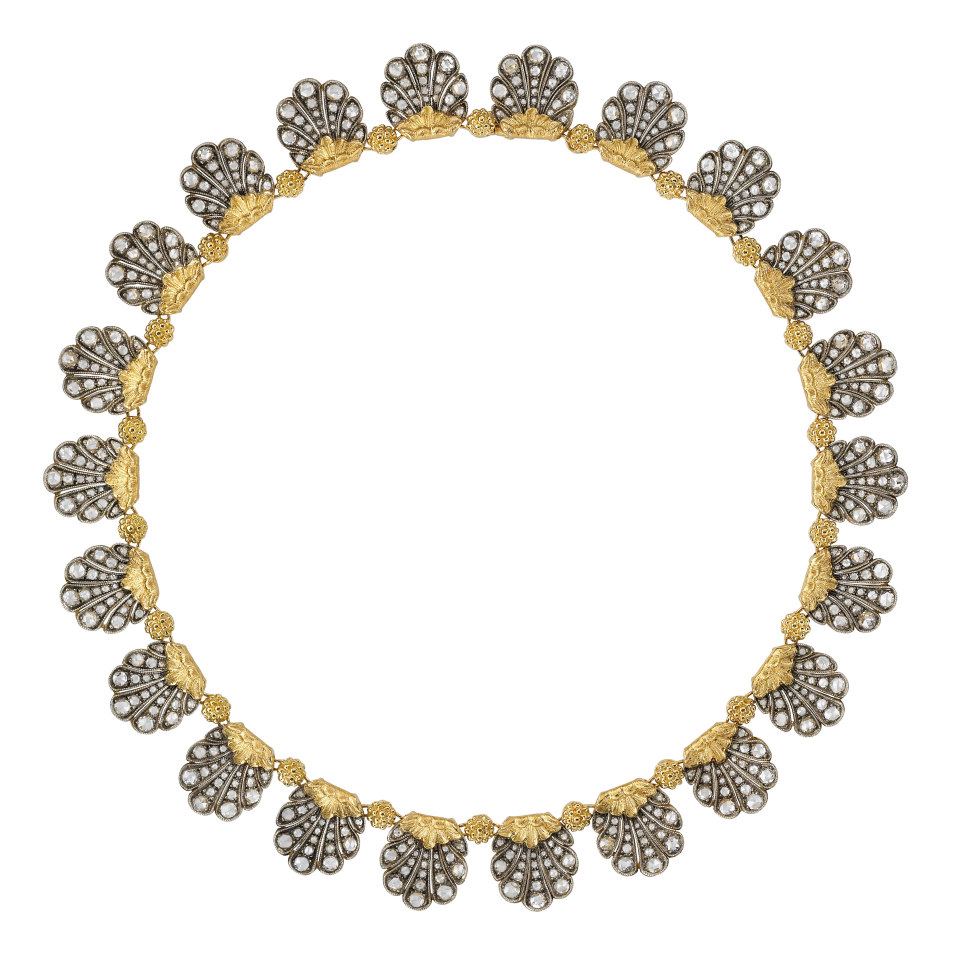 The necklace is composed of yellow gold elements and rose-cut diamonds, alternating with white gold shapes set with brilliant-cut diamonds and rendered even more precious by a central yellow gold part set with yellow fancy diamonds.