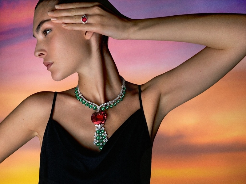 Bvlgari balances the striking shade of pink-fuchsia spinel with green emerald beads to create the dreamlike Magnifica Imperial Spinel necklace featuring a staggering 131.21 kts of rare, central gemstone.