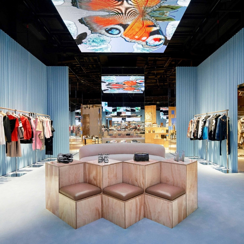 The new store features fixtures and plinths constructed in a variety of materials and textures, from plywood to mirror and high-gloss finishes. The store unveils a colour palette of beige, pistachio, pink and blue, as well as references to the Thomas Burberry Monogram and the fawn print. The 539 sqm/5800 sqft store features 10 rooms and offers a truly interactive experience, with features including: Interactive Store Window, QR Codes, Thomas’s Cafe, Fitting Rooms, and The Trench Experience – an exclusive space that customers can unlock as they build their social currency.