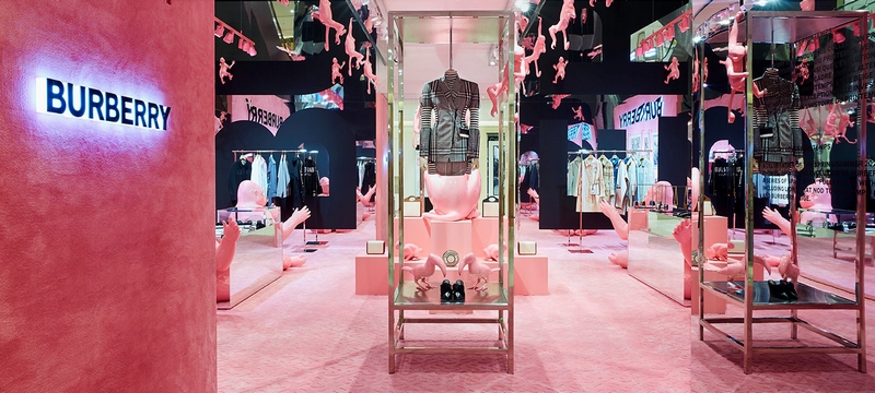 The installation celebrates both institutions’ iconic colour palettes – from Burberry beige to Printemps pink – and features carpets imprinted with the Thomas Burberry logo, contrasting mirrored surfaces and black and white watercolor print walls.
