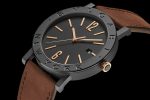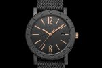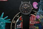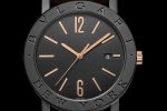 Bvlgari Cities Special Edition watch features a mechanical manufacture movement, automatic winding, BVL 191 caliber. The 41 mm stainless steel case is treated with black Diamond Like Carbon. Other highlights includes Bvlgari and the city name engraving on the bezel, transparent case back, 18 kt rose gold crown, black lacquered grained dial, rose gold indexes, and a date aperture at 3 o’clock.