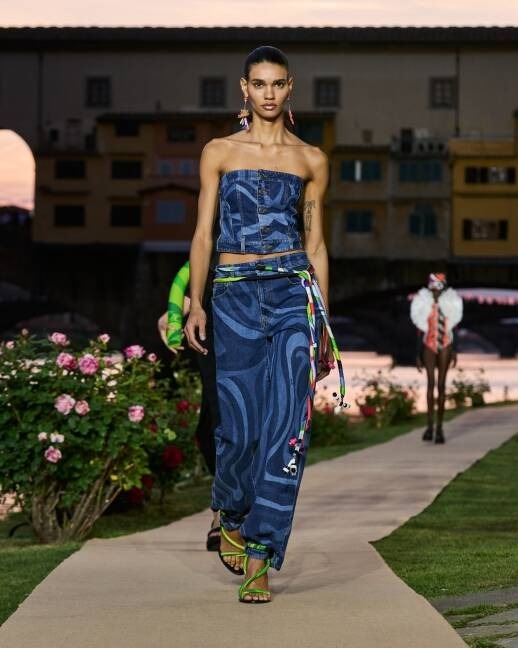 Miceli’s vision for Pucci seems to be one of exploring new frontiers, with a clear emphasis on experimentation and playfulness. This is evident in the use of denim reworked with the signature Marmo print, long zip pulls embellished with strass, and floaters printed with colorful Pucci prints. While these elements might come across as trendy and youthful, some might argue that they do not necessarily stay true to the brand’s core values of elegance and timelessness.