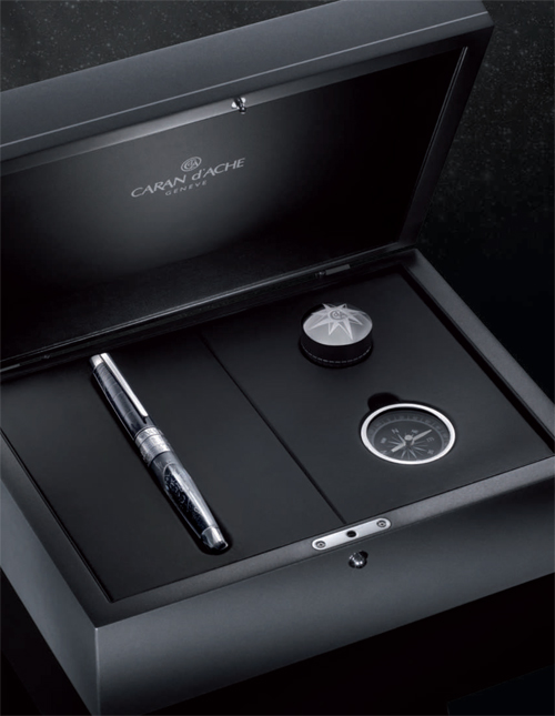 Caran d’Ache, the Swiss “Maison de Haute Ecriture”, produced an unique instrument that explores the sky and the stars. Like inventors always searching for new solutions, the craftsmen at Caran d’Ache have worked closely with an astronomer to create Caelograph luxury fine writing instrument collection. Caelograph includes a fountain pen, roller pens, an inkwell, and a compass.