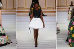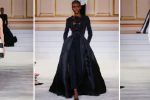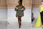 A sense of discipline is mixed with exuberance and grandeur. Dresses with portrait necklines and romantic spiral folds put the Carolina Herrera woman in the spotlight, holding court. The vivid jewel-tone color palette is grounded in sumptuous textures of velvet and taffeta in black, gilded in gold embroidery.
