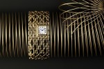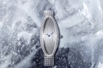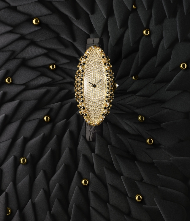This watch’s volume is viewed as a surface for creation. It is studded with emeralds and Paraiba tourmalines, black spinels, yellow sapphires or diamonds. When perceived with the eyes, each gemstone becomes a minuscule speck of light. Meanwhile the dial in the middle is paved with dazzling diamonds.