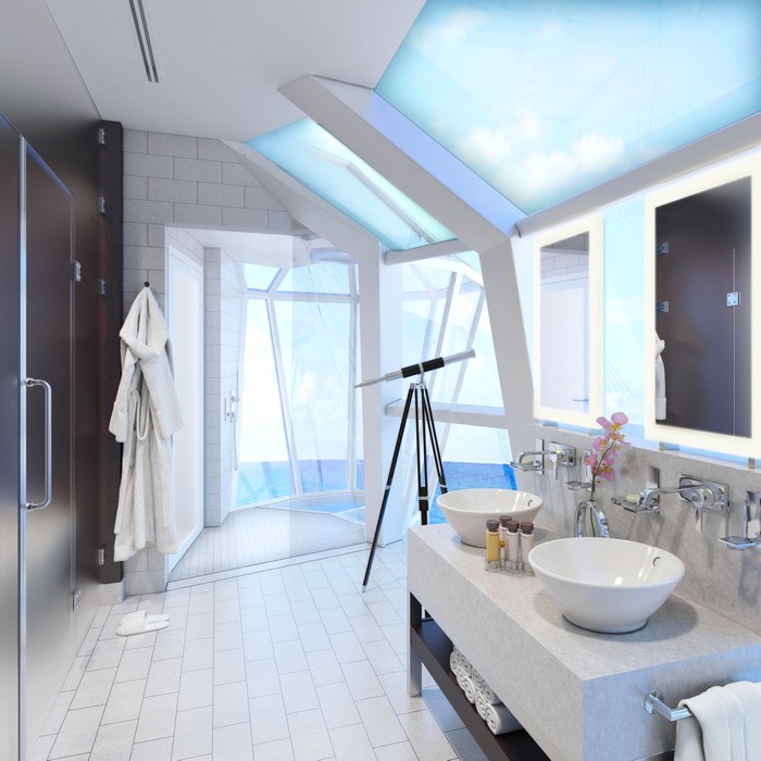 “…if guests seek even further privacy, the shower also features ‘smart glass.’ At the flick of a switch, guests can activate an electrochromatic technology which instantly transforms the glass from transparent to translucent,” explained Celebrity’s Senior VP of Hotel Operations Lisa Lutoff-Perlo.