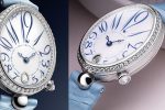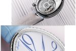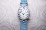 In a premiere for the luxury watchmaker, Breguet highlights the delicate oval shape of the dial of the Reine de Naples watch with pure, bright white grand feu enamel, complete with numerals in celestial shades.