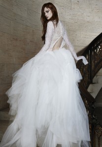 Vera Wang Bride Spring 2015 Collection – Ivory web lace long sleeve blouse. Ivory tulle ball gown skirt with ruched details.