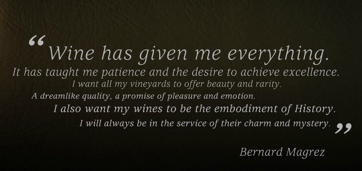 “Wine has given me everything. It has taught me patience and the desire to achieve excellence. I want all my vineyards to offer beauty and rarity. A dreamlike quality, a promise of pleasure and emotion. I also want my wines to be the embodiment of History. I will always be in the service of their charm and mystery,” explains Bernard Magrez.