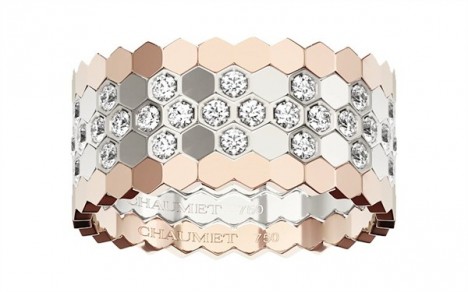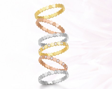 Bee my love is the expression of growing love. The bee has been always a Chaumet icon, a symbol of power and immortality, and has now inspired a new collection of romantic jewellery that perfectly imitate honeycomb. There are nine ring designs, each displaying the perfect geometry of the honeycomb, which can be worn alone or in 5 million combinations.