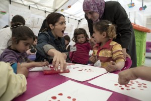 UNICEF supporter and CHIME FOR CHANGE campaign Co-Founder Salma Hayek meets with Syrian refugee children and aid workers who are providing a safe environment through counselling, play and learning activities. On April 25, Hayek visited Syrian refugees in Lebanon's Bekaa Valley with UNICEF to draw attention to the urgent humanitarian needs of children and families in the region, and to launch Gucci's CHIME for the Children of Syria fundraising appeal. (PRNewsFoto/UNICEF)